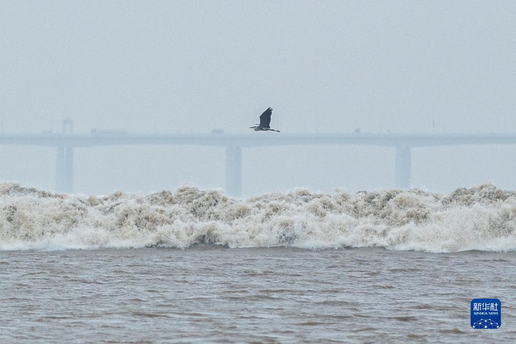 9月13日,一只水鳥(niǎo)在錢(qián)塘江潮水上空飛舞。