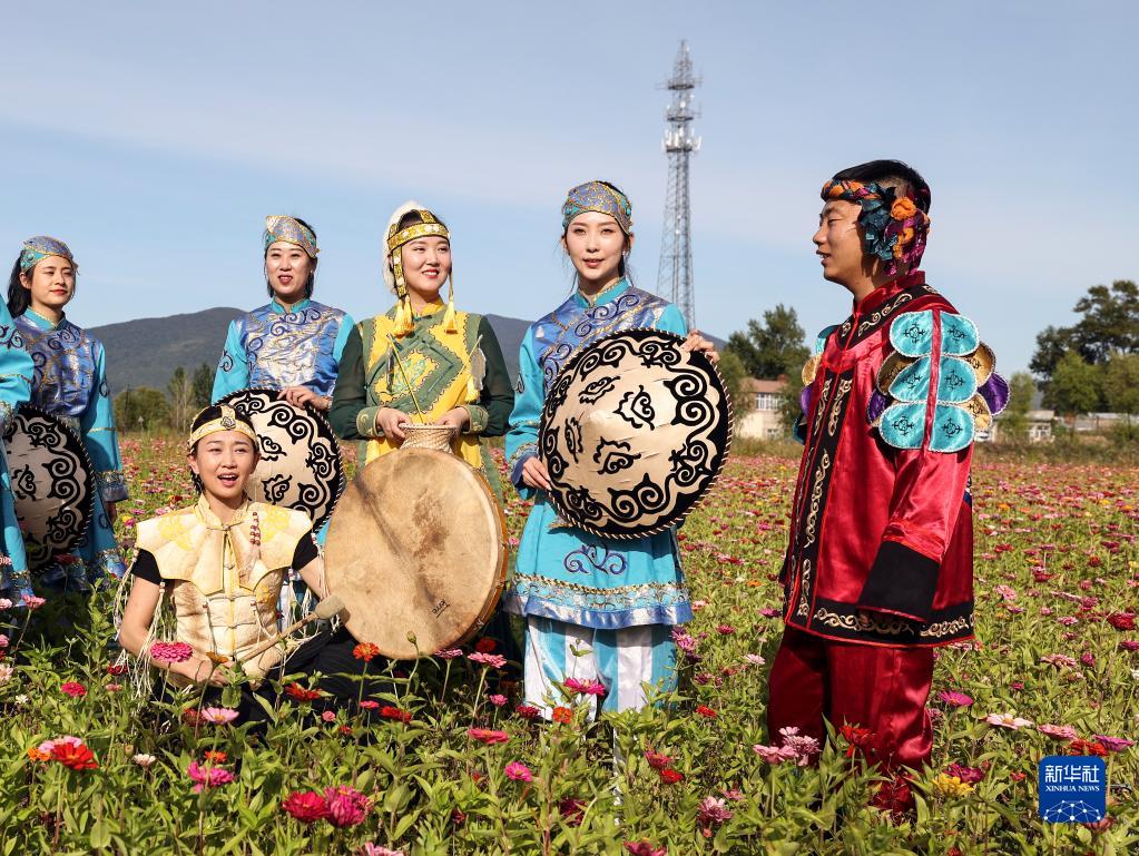 9月4日,在黑龍江撫遠市烏蘇鎮抓吉赫哲族村,尚美含(右二)和赫哲族青年排練民族舞蹈。