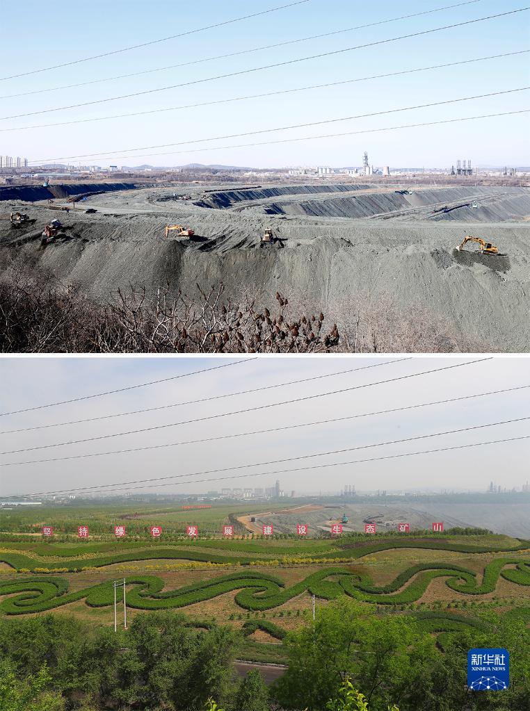 這是一張拼版照片:上圖為遼寧省撫順市西露天礦部分區域生態(tài)恢復前的場(chǎng)景(2019年3月6日攝,資料照片);下圖為2022年6月2日拍攝的遼寧省撫順市西露天礦部分區域生態(tài)恢復后的場(chǎng)景(新華社記者楊青攝,無(wú)人機照片)。新華社發(fā)