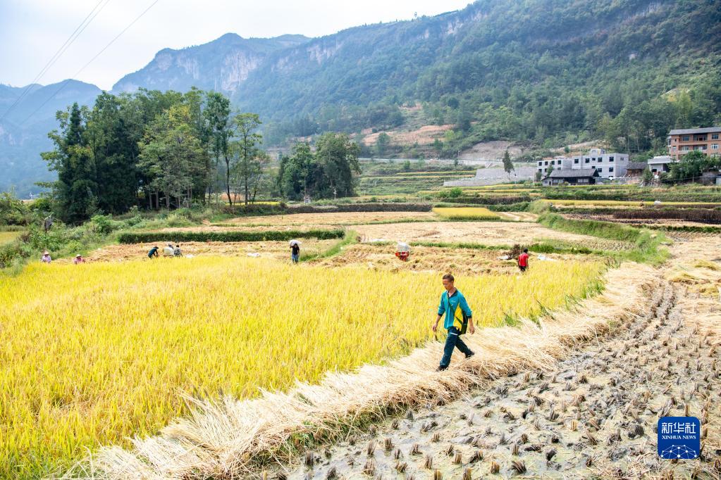 9月15日,投遞員張永洪行走在武陵山間的稻田田坎上。