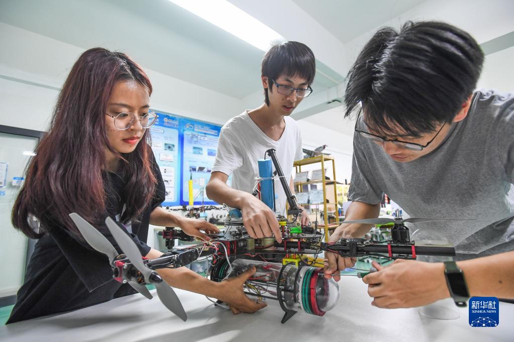 廣東工業(yè)大學(xué)學(xué)生團隊在“工大創(chuàng )谷”研發(fā)空水兩棲遠程巡檢平臺(9月14日攝)。