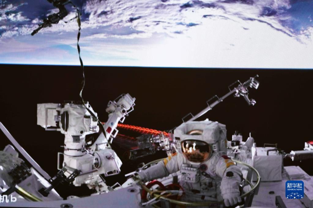 9月17日在北京航天飛行控制中心拍攝的神舟十四號航天員蔡旭哲出艙畫(huà)面。