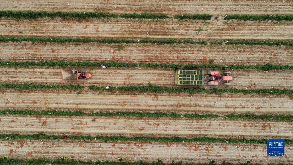 9月16日,工人在寧夏銀川市賀蘭山東麓的沃爾豐酒莊采摘釀酒葡萄(無(wú)人機照片)。
