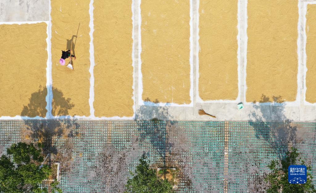 9月17日,村民在貴州省黔東南苗族侗族自治州從江縣剛邊壯族鄉剛邊村晾曬稻谷(無(wú)人機照片)。
