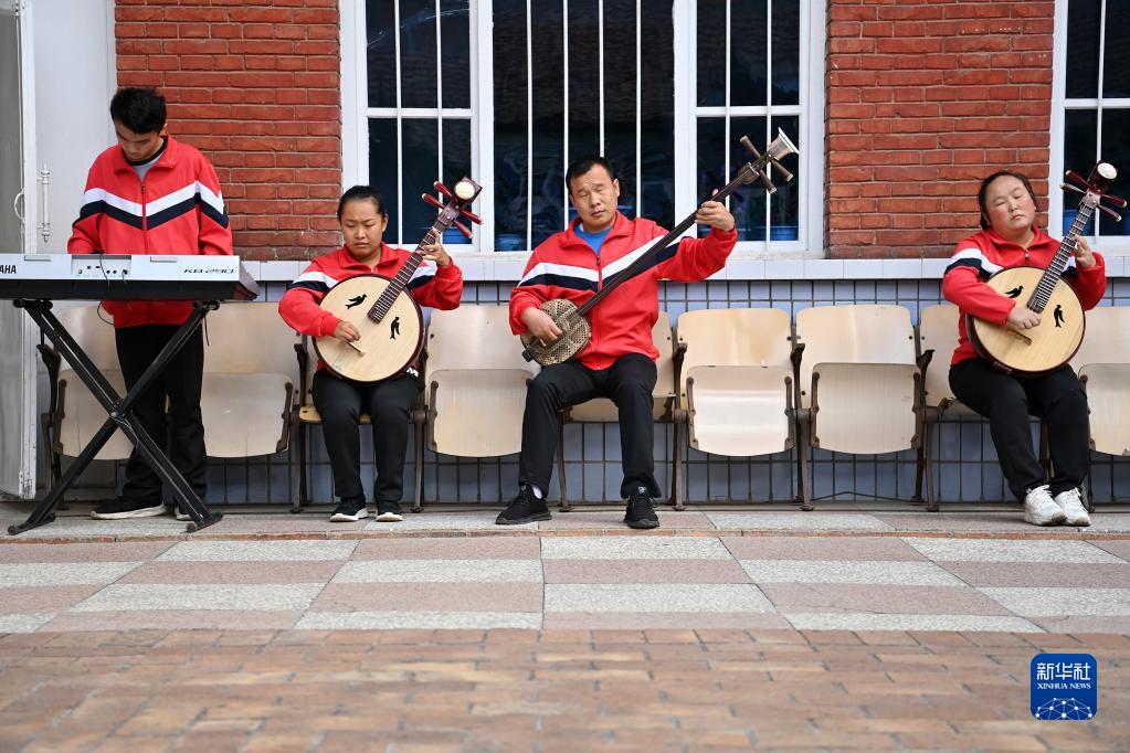 陵川縣盲人曲藝宣傳隊隊員在院子里練習樂(lè )器(9月15日攝)。