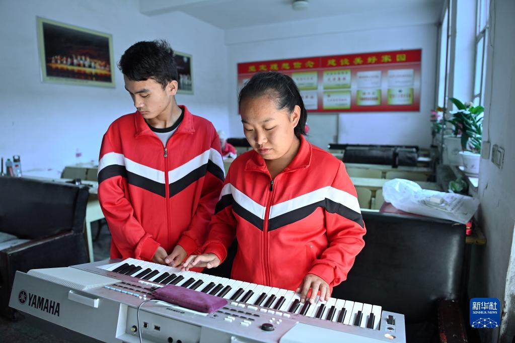 陵川縣盲人曲藝宣傳隊兩名隊員在排練室練習電子琴(9月15日攝)。