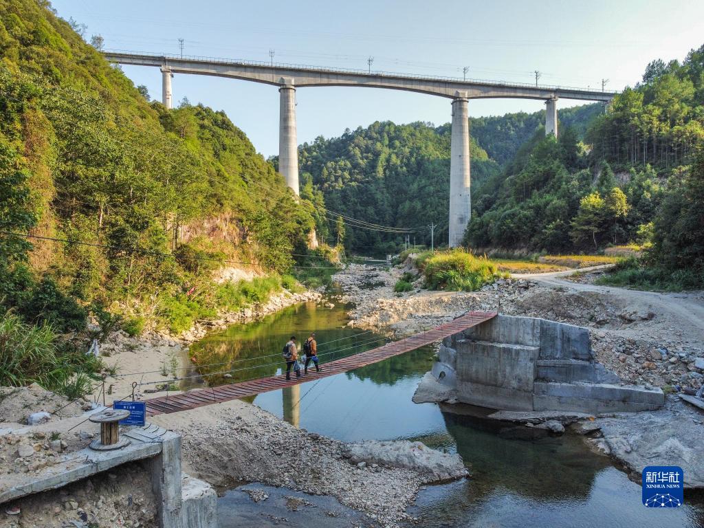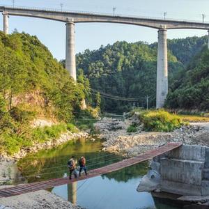9月19日,看守員趙偉燈(右)與蔡金礦在通往赤嶺隧道防洪值守點(diǎn)的便橋上行走(無(wú)人機照片)。