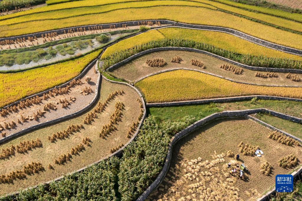 9月19日,在貴州省畢節市百里杜鵑管理區黃泥鄉朝門(mén)村,農民在收割水稻(無(wú)人機照片)。