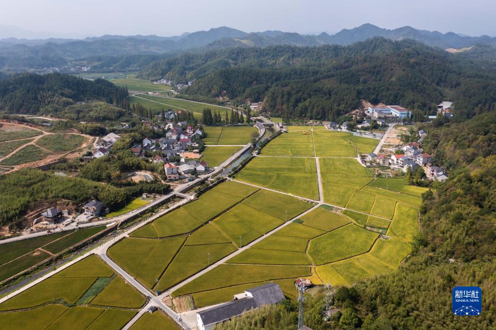 9月24日,空中俯瞰杭州市臨安區太陽(yáng)鎮太陽(yáng)米稻田基地(無(wú)人機照片)。