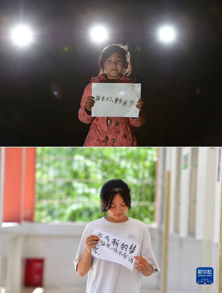 上圖:在廣西大化瑤族自治縣板升鄉弄勇小學(xué),9歲的劉順媛展示自己的夢(mèng)想(2015年1月28日攝);下圖:已經(jīng)到縣城讀高中的劉順媛,有了新的夢(mèng)想(2022年7月26日攝)(拼版照片)。