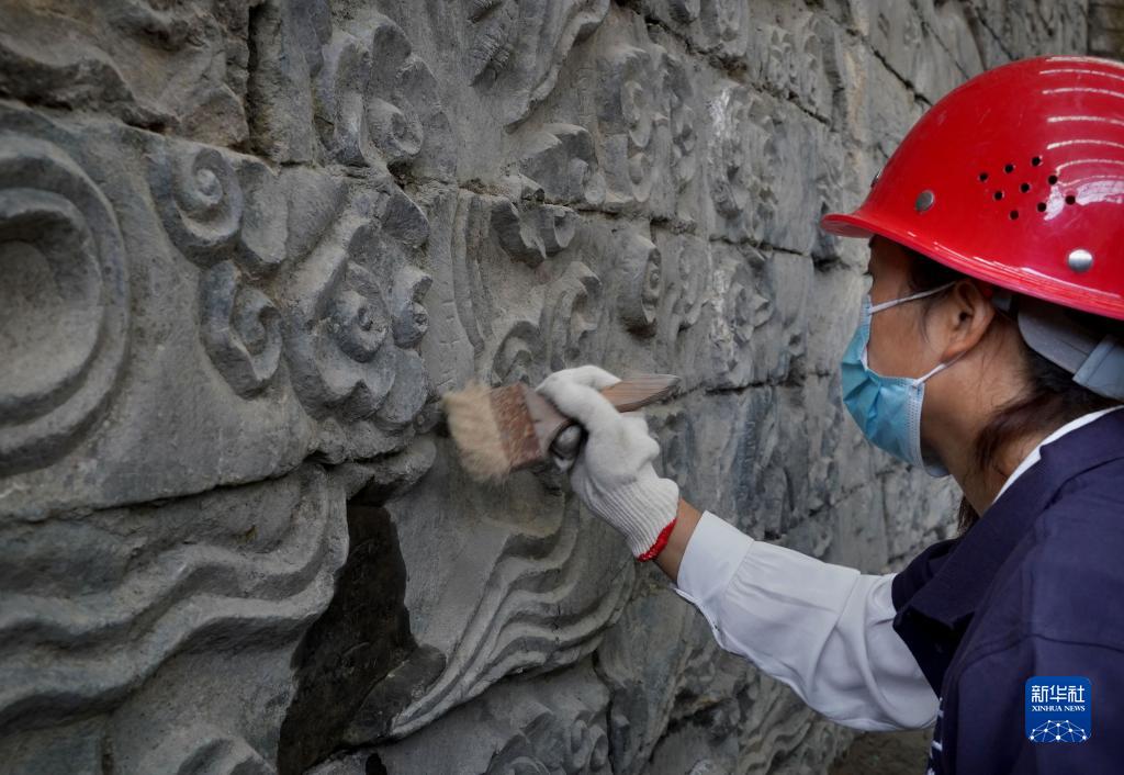 工作人員在清理巨幅石雕祥瑞壁畫(huà)(9月21日攝)。