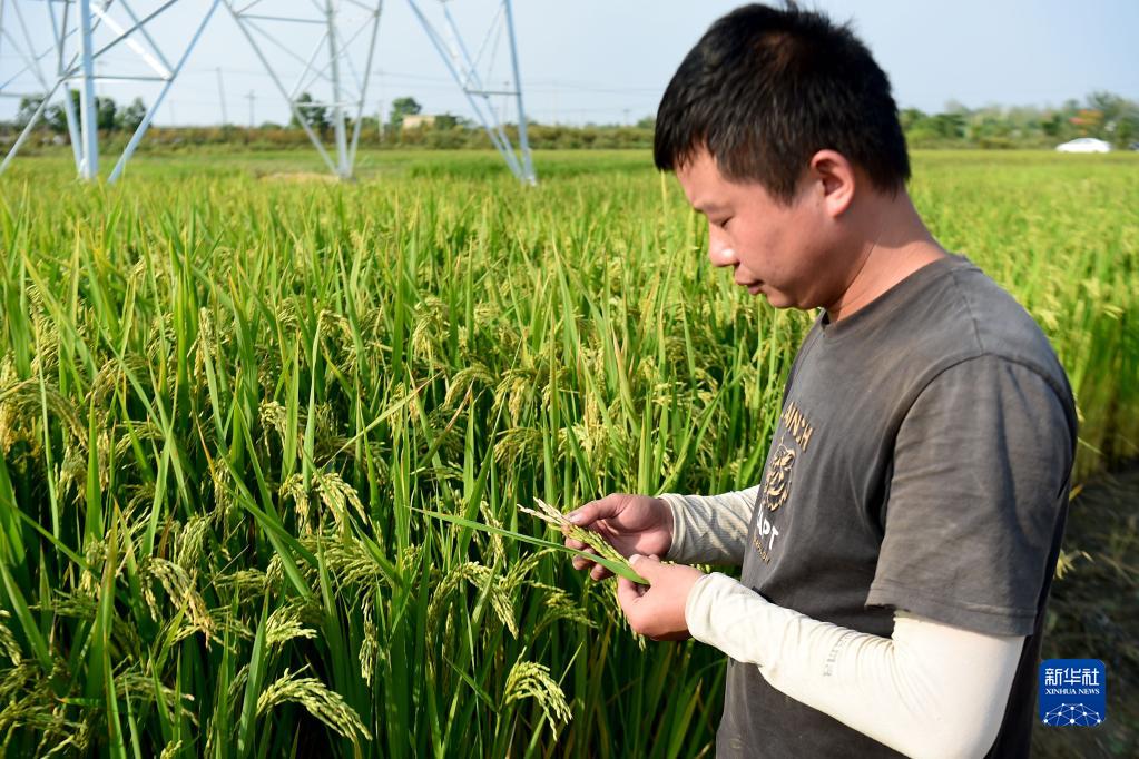 9月26日,安徽省合肥市長(cháng)豐縣崗集鎮牛寨村種糧大戶(hù)陳磊在查看節水抗旱稻的生長(cháng)情況。