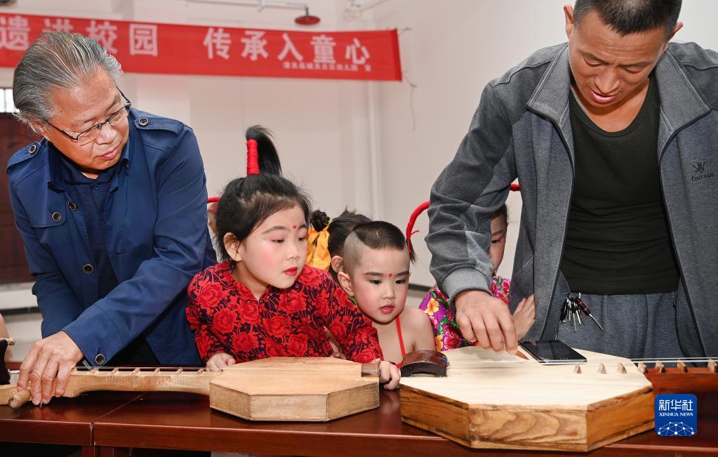 潼關(guān)縣城關(guān)北區幼兒園的孩子觀(guān)看老腔藝人調試月琴(9月27日攝)。