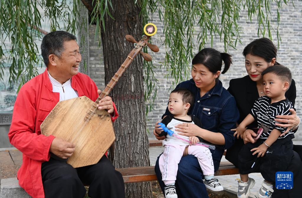 西北綜勘黃河老腔藝術(shù)團主唱薛銀照(左一)在黃河岸邊向游人介紹“黃河老腔”知識(9月26日攝)。