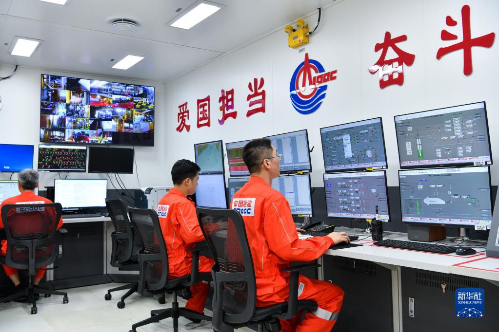 中海油工作人員在“?;惶枴笨刂剖依镞M(jìn)行操作(9月30日攝)。
