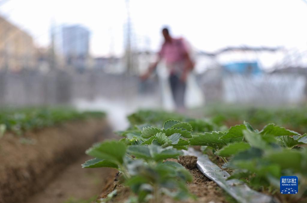 10月6日,貴州省黔東南苗族侗族自治州丹寨縣金泉街道村民在給草莓苗淋水。