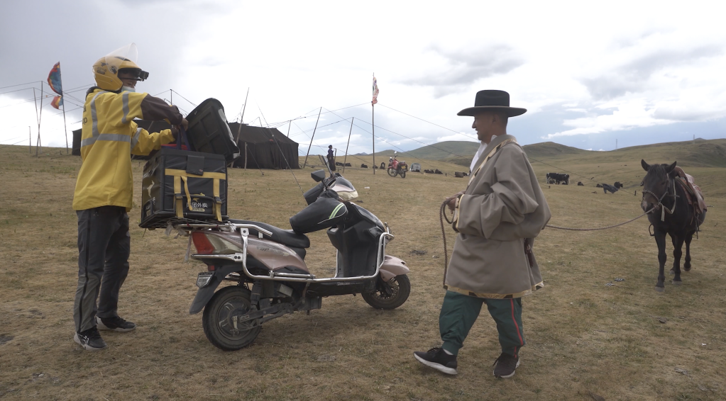 就連長(cháng)期生活在草原上的牧民也開(kāi)始點(diǎn)外賣(mài)。牧民們喜歡點(diǎn)川菜、漢堡和炸雞。甲熱經(jīng)常騎著(zhù)電瓶車(chē)馳騁在草原上送餐,沿著(zhù)牛羊踩踏出的小路,一直送到帳篷門(mén)口。