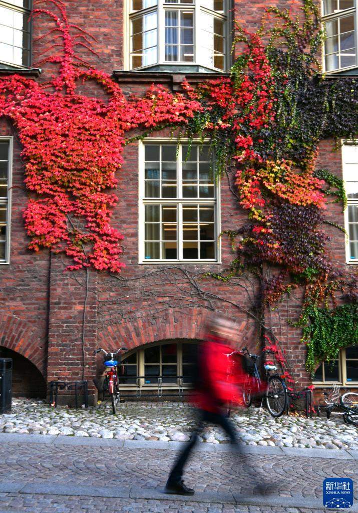 10月7日,一名行人走在瑞典斯德哥爾摩的瑞典皇家理工學(xué)院內。
