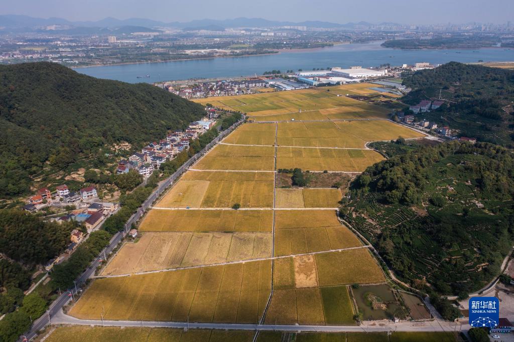 10月19日,空中俯瞰杭州市富陽(yáng)區漁山鄉糧食生產(chǎn)功能區(無(wú)人機照片)。漁山鄉糧食生產(chǎn)功能區毗鄰富春江,面積1700余畝,采取統一品種布局、統一測土配方、統一機插、統一病蟲(chóng)害防治、統一機收、統一信息發(fā)布的“六統一”栽培技術(shù),成為富陽(yáng)成效顯著(zhù)的糧食生產(chǎn)示范基地之一。