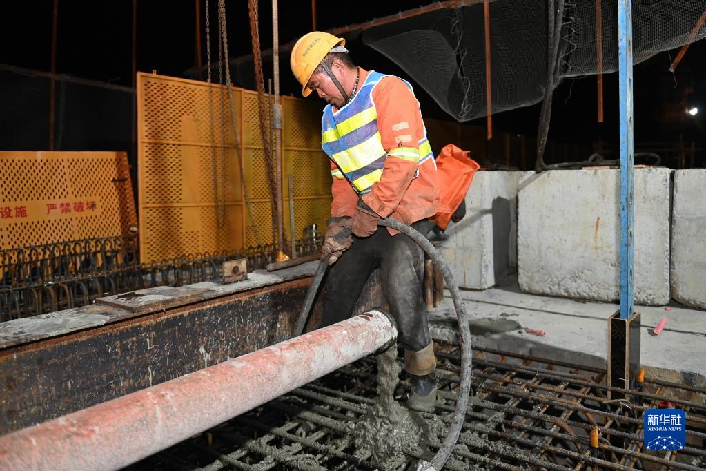 10月20日凌晨,工程技術(shù)人員在杭溫鐵路二期工程跨杭黃鐵路特大橋最大跨度連續梁施工現場(chǎng)作業(yè)。