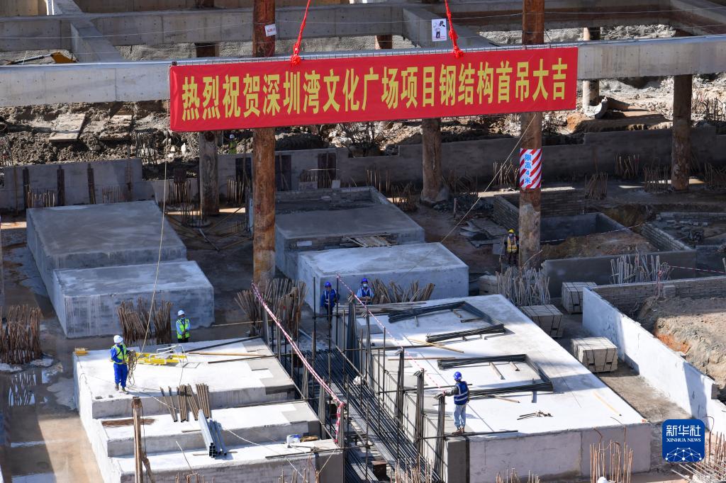 10月25日,在深圳灣文化廣場(chǎng)建設工地,首塊鋼結構在吊裝。