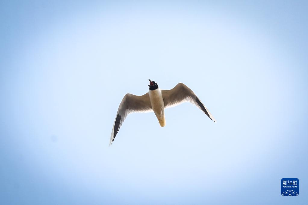 在遼河口國家級自然保護區南小河保護站附近的濕地,黑嘴鷗在空中飛翔(2022年6月17日攝)。