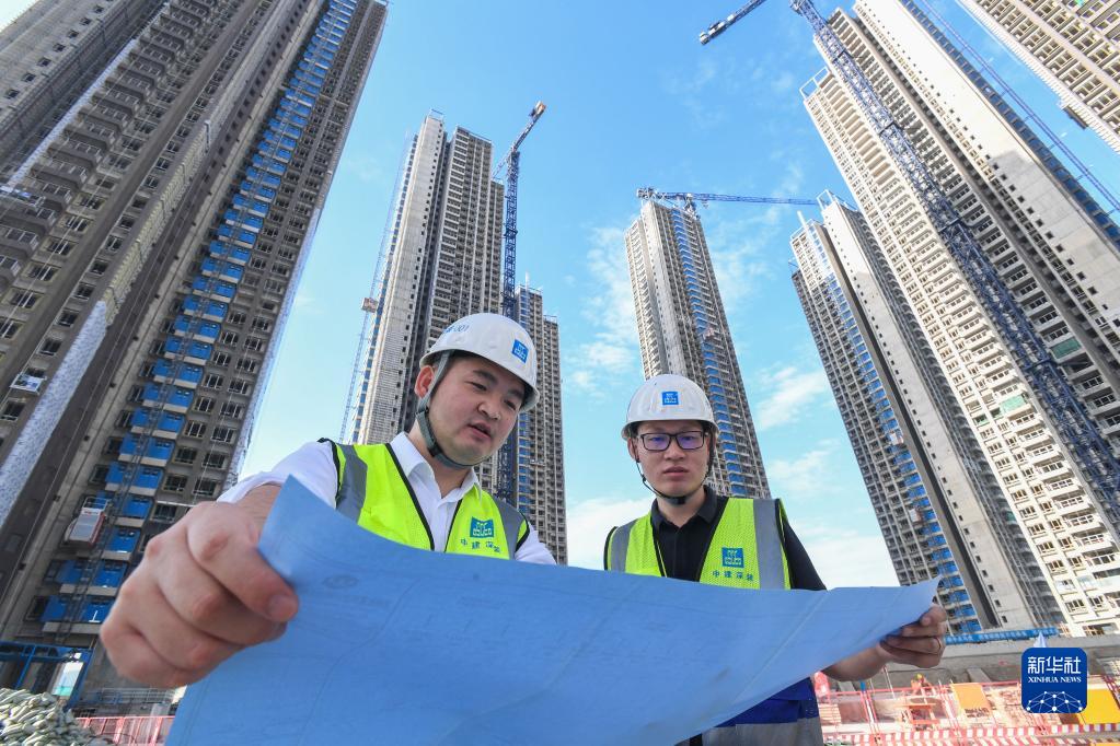 中建深裝項目經(jīng)理張紅軍(左)和工程師在華富村回遷安置房建設現場(chǎng)進(jìn)行幕墻裝配技術(shù)復核(10月20日攝)。