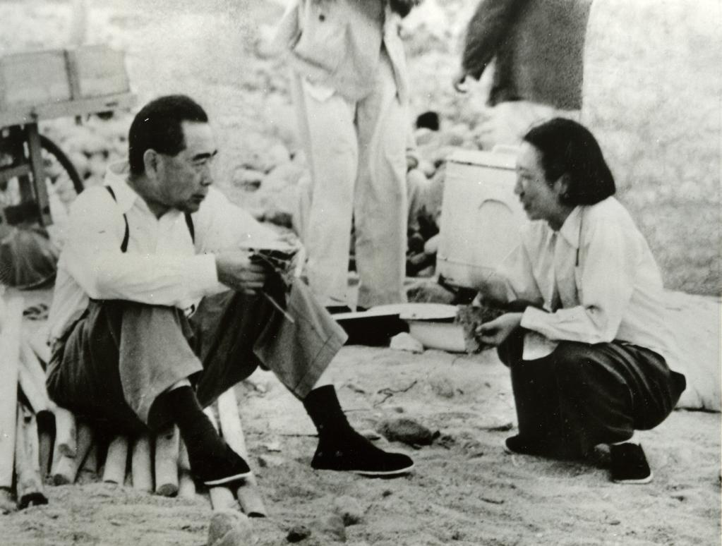 1958年3月,周恩來(lái)同志和錢(qián)正英同志在十三陵水庫勞動(dòng)工地親切交談。