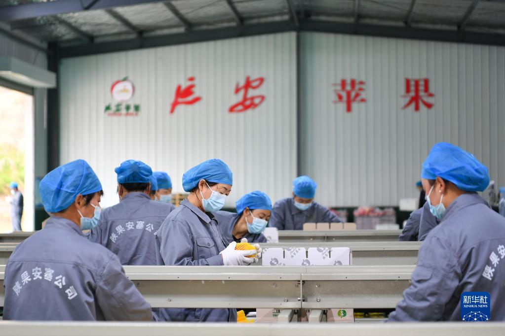 10月27日,在陜西省延安市安塞區南溝村,工作人員在蘋(píng)果洗選車(chē)間裝箱打包蘋(píng)果。 新華社記者 張博文 攝