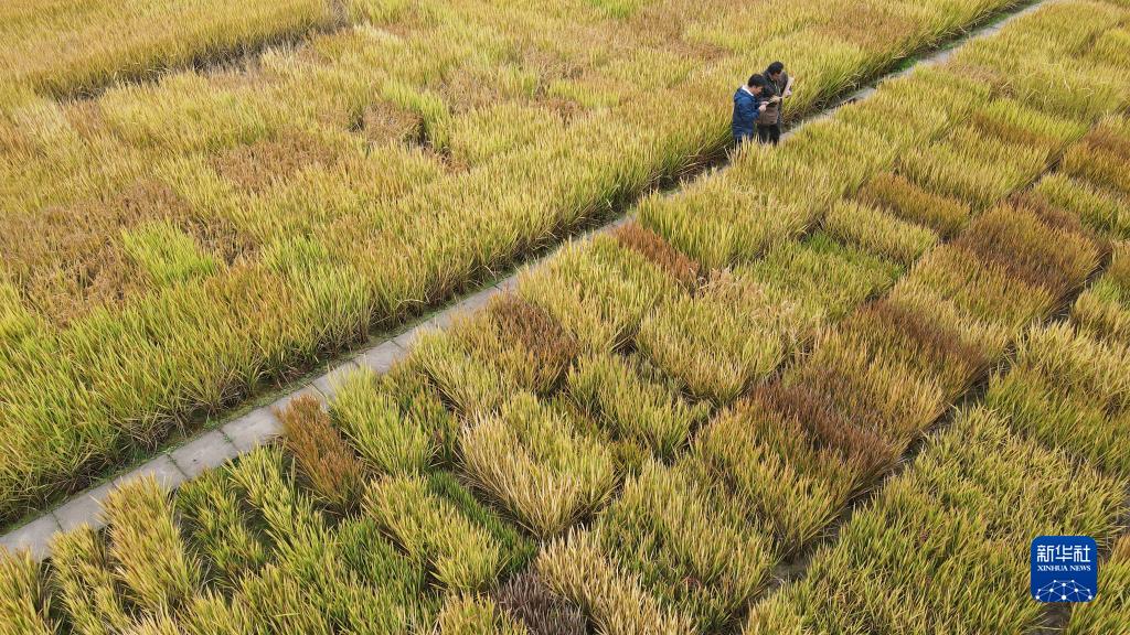 10月27日,在中科院合肥研究院智能所離子束生物工程與綠色農業(yè)研究中心的育種基地里,研究員劉斌美(右)和副研究員葉亞峰觀(guān)察用于科研的水稻表型(無(wú)人機照片)。