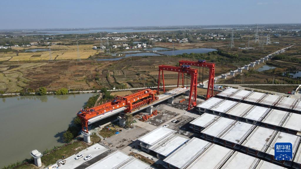 這是中鐵四局合新鐵路安徽段站前七標箱梁架設現場(chǎng)(10月30日攝,無(wú)人機照片)。
