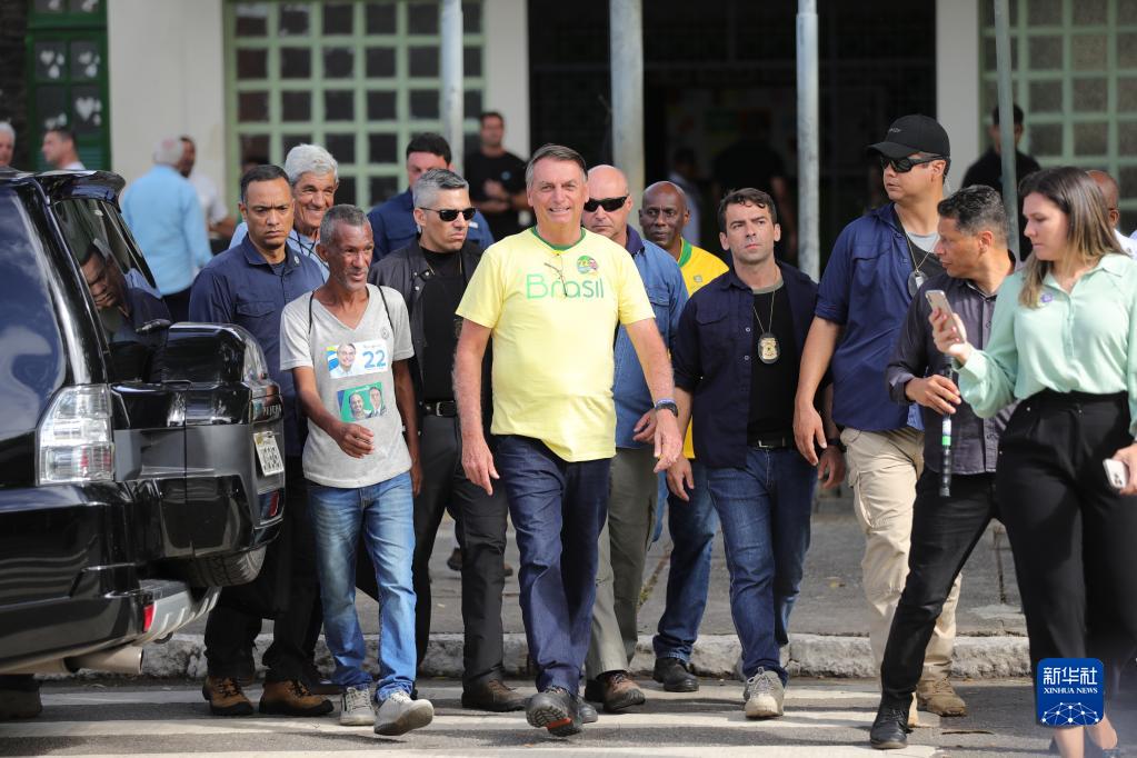 10月30日,巴西右翼陣營(yíng)自由黨候選人、現任總統博索納羅(中)在里約熱內盧參加投票后離開(kāi)投票站。