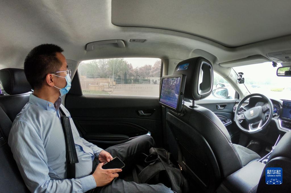 在北京經(jīng)濟技術(shù)開(kāi)發(fā)區,一名男士在體驗“主駕無(wú)人、副駕駛配備安全員”的無(wú)人駕駛車(chē)(4月25日攝)。