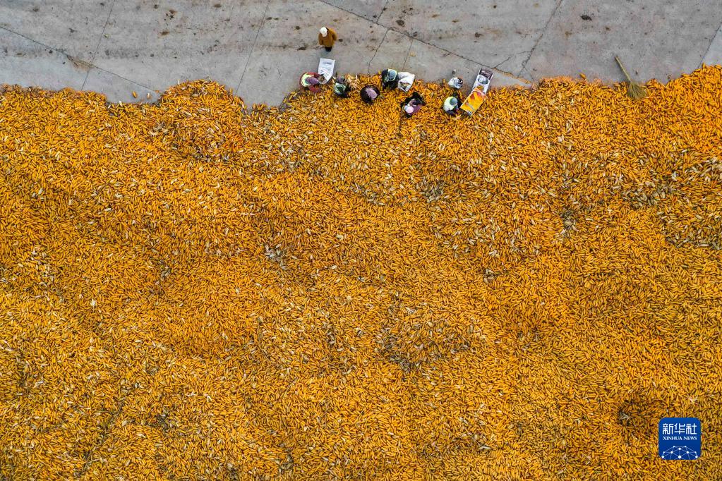 農民在吉林省公主嶺市環(huán)嶺街道土城子村志和農機服務(wù)專(zhuān)業(yè)合作社內分揀收獲的玉米,準備進(jìn)行下一步的儲存工作(無(wú)人機照片,11月1日攝)。