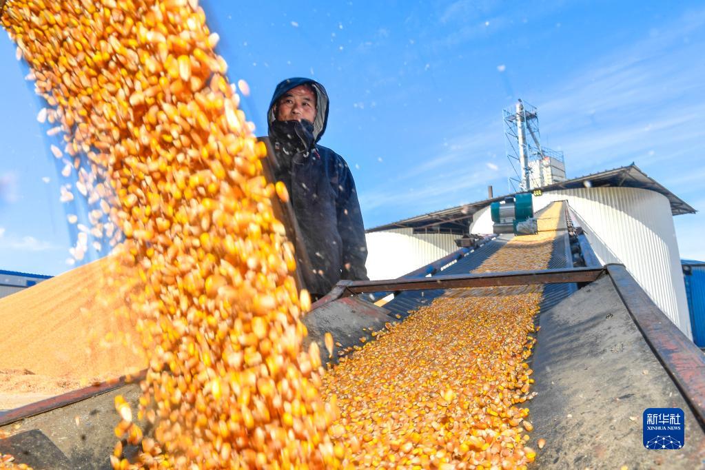 在吉林省公主嶺市樂(lè )農糧食收儲有限責任公司,工作人員通過(guò)傳送帶將玉米轉運至存儲倉(11月2日攝)。