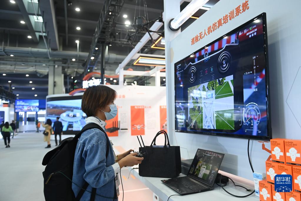 11月3日,觀(guān)眾在展館體驗巡檢無(wú)人機仿真培訓系統。