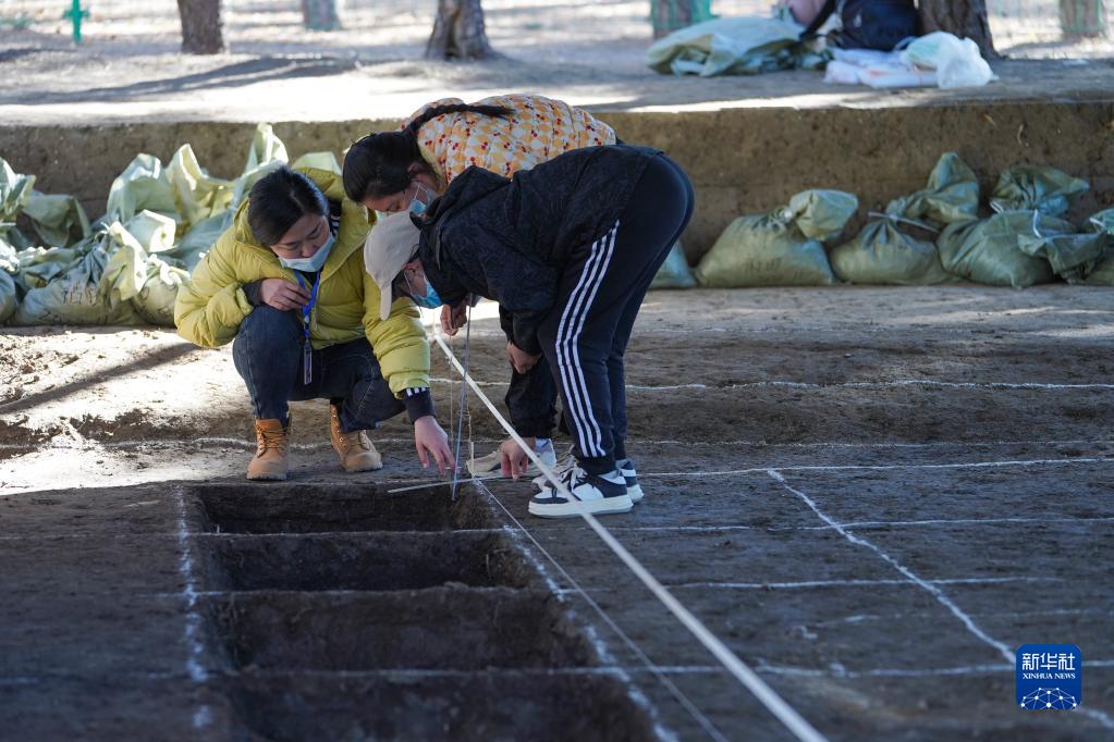 11月4日,考古人員在皇家稻田遺址考古發(fā)掘現場(chǎng)測量土層厚度。