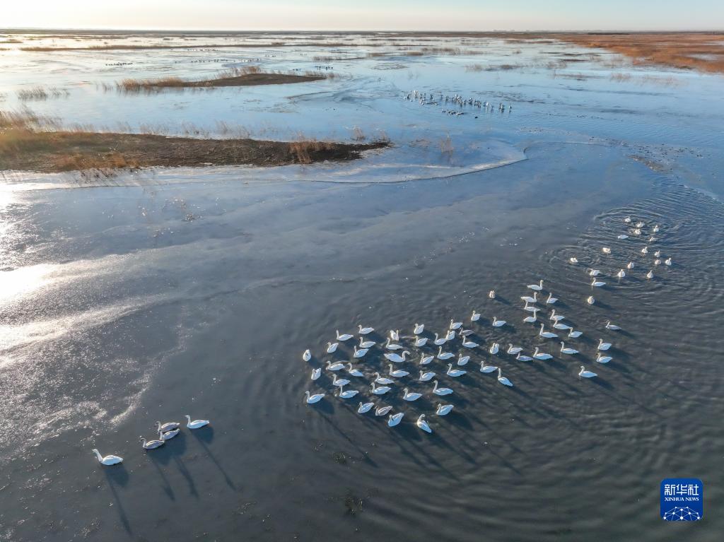 11月4日在吉林省白城市鎮賚縣莫莫格國家級自然保護區拍攝的候鳥(niǎo)(無(wú)人機照片)。