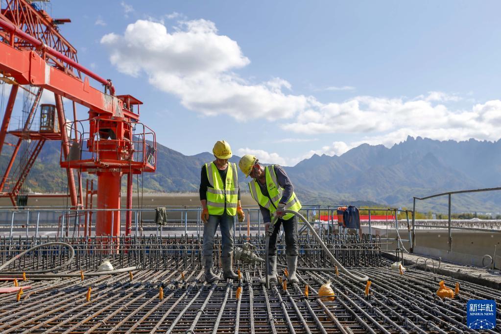 11月7日,中國鐵建大橋局池黃鐵路黃山制梁場(chǎng)施工人員在最后一榀箱梁澆筑現場(chǎng)施工。