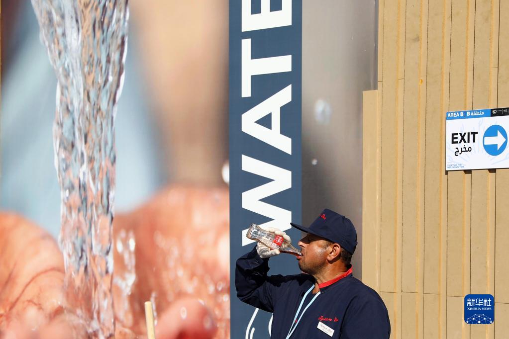 11月7日,在埃及沙姆沙伊赫的聯(lián)合國氣候變化大會(huì )舉辦場(chǎng)地,一名工作人員在一張宣傳海報旁喝飲料。