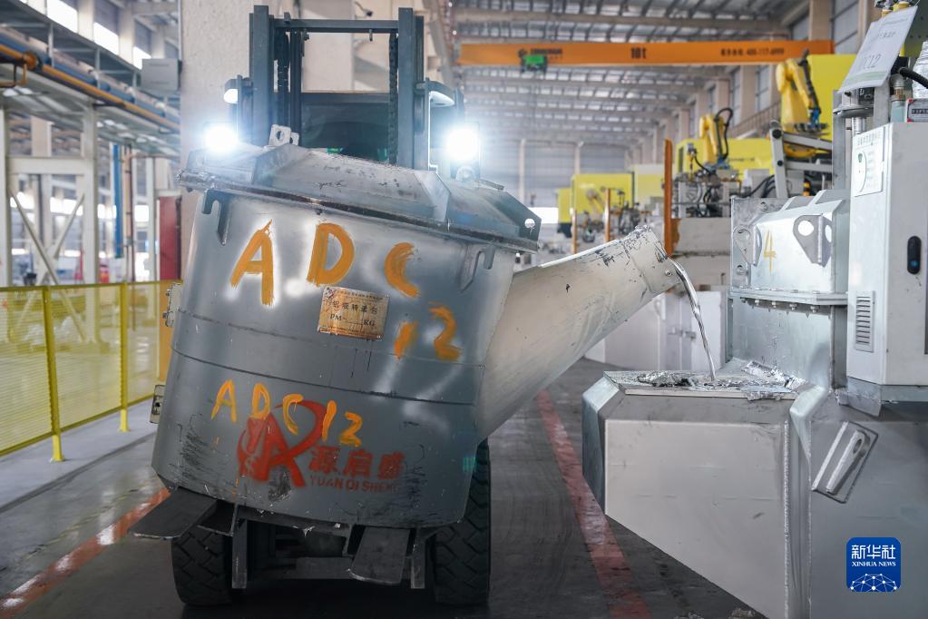 11月7日,在安徽省馬鞍山市含山縣三基輕合金成型科技有限公司,工人操作叉車(chē)向壓鑄機的燃氣保溫爐內添加鋁液。