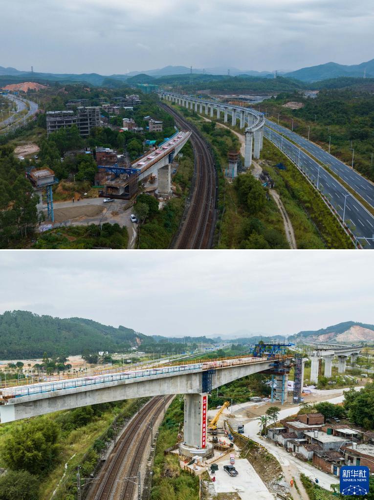 拼版照片:清遠磁浮旅游專(zhuān)線(xiàn)長(cháng)隆特大橋跨京廣鐵路連續梁轉體前后的對比(上圖攝于11月7日,下圖攝于11月8日,無(wú)人機照片)。