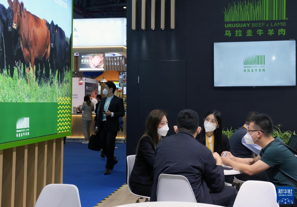 11月7日,在第五屆進(jìn)博會(huì )上,烏拉圭牛羊肉產(chǎn)品的展商與客商在現場(chǎng)洽談。
