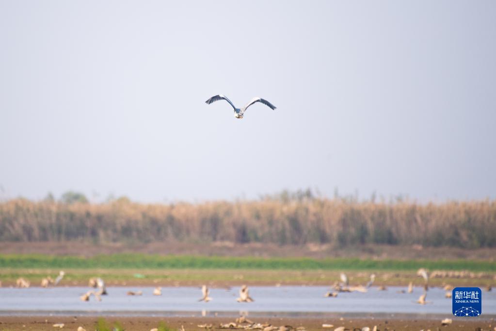 11月10日,一只蒼鷺在湖南西洞庭湖濕地上空飛翔。