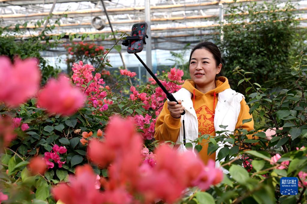 11月9日,網(wǎng)絡(luò )主播在山東省濱州市惠民縣麻店鎮的一家花卉種植基地直播銷(xiāo)售花卉。