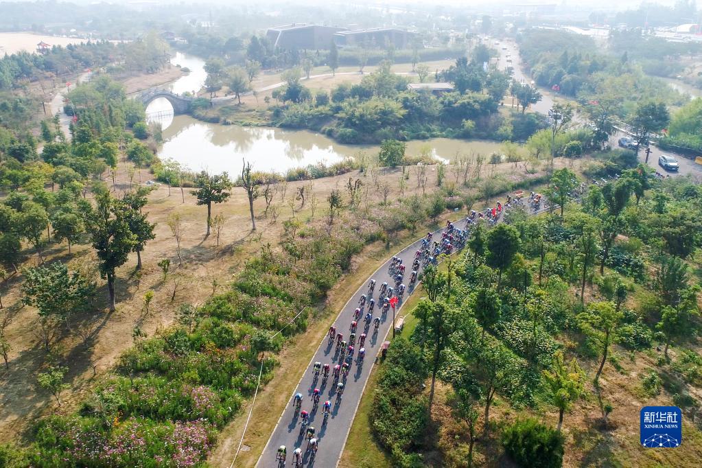 環(huán)鄱陽(yáng)湖國際自行車(chē)賽在南昌市高新區鄱陽(yáng)湖畔舉行,自行車(chē)選手在騎行中(2019年9月28日攝)。