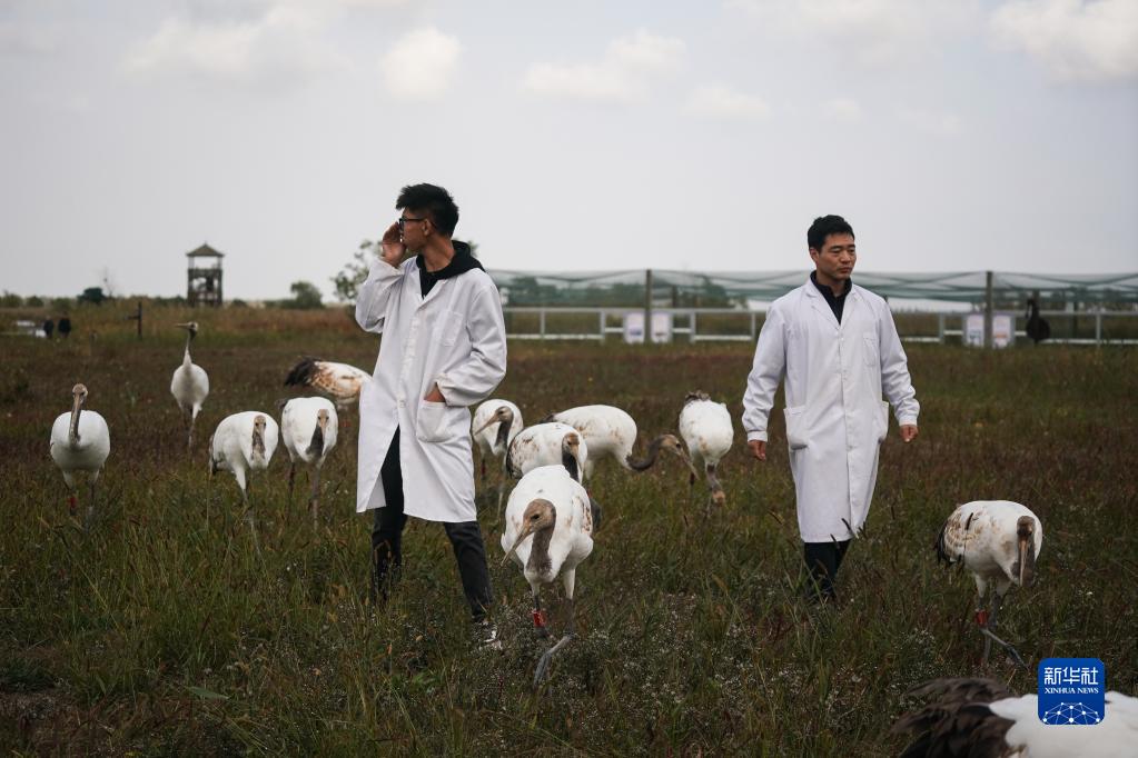 保護區馴養員姜官宏(右)和蔡新杰與人工繁育的丹頂鶴互動(dòng)(11月8日攝)。