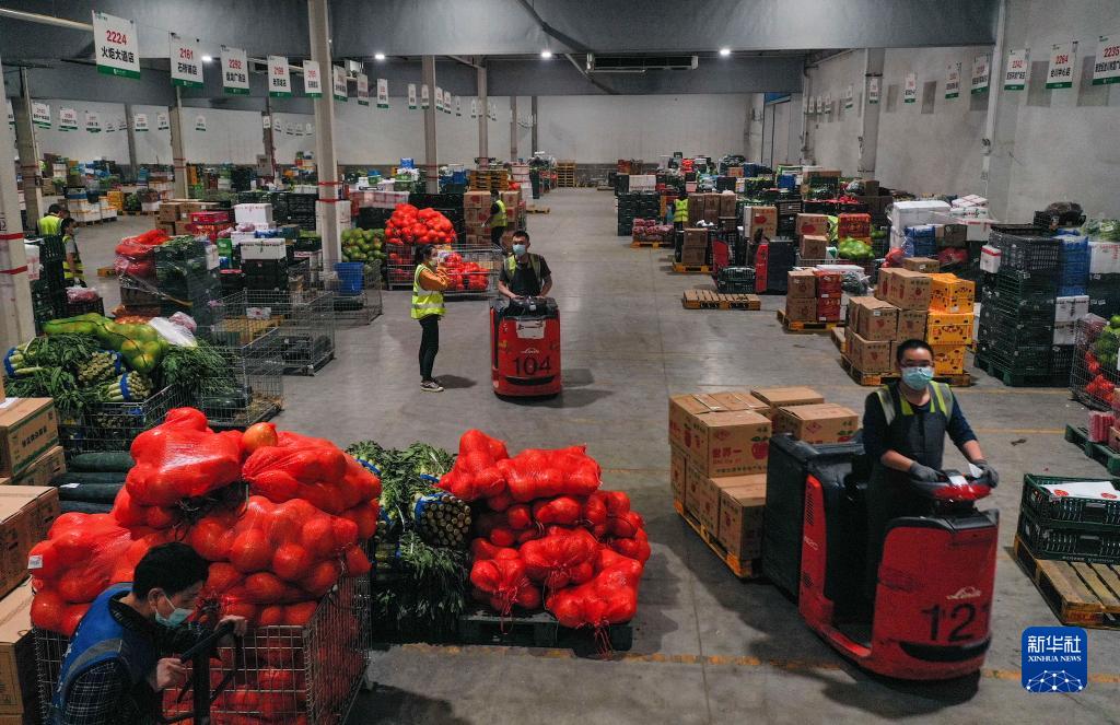 11月12日,在位于渝北區的重慶慶榮物流有限公司,工作人員在果蔬商品分揀倉作業(yè)(無(wú)人機照片)。