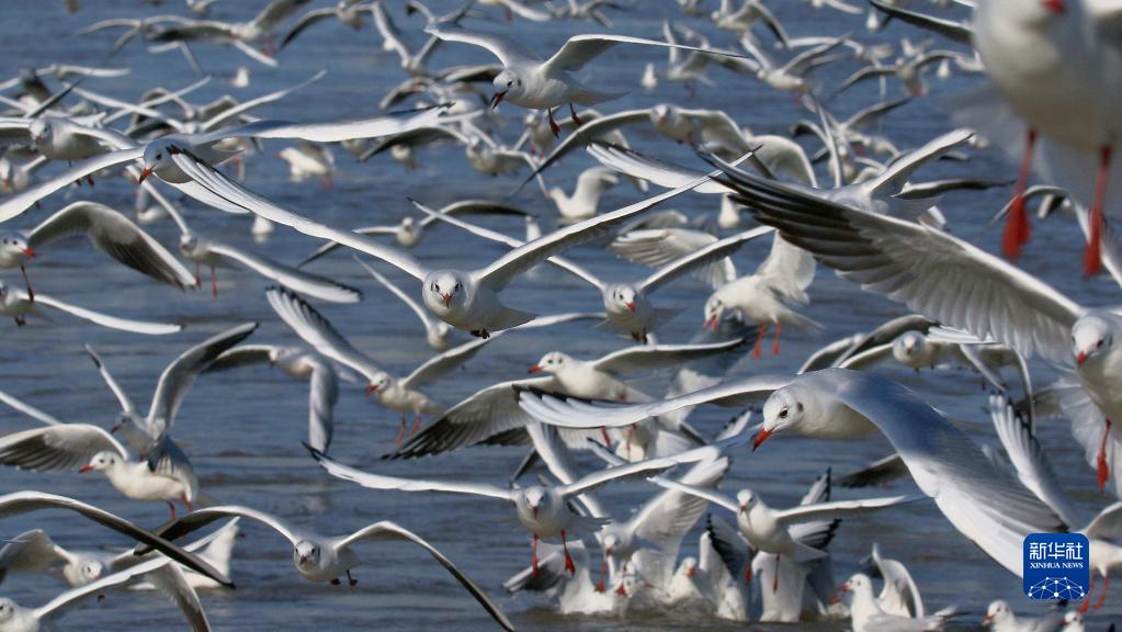 在松花江哈爾濱城區段,紅嘴鷗在覓食(2021年10月7日攝)。