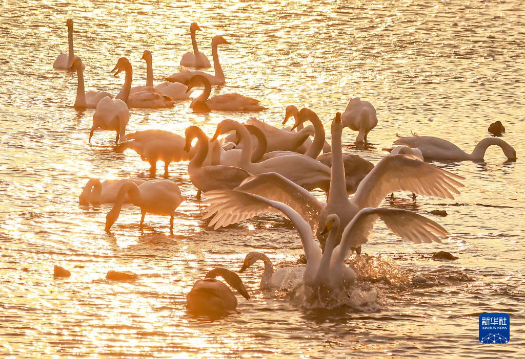 近日,大批大天鵝飛抵山東省榮成市成山鎮天鵝湖濕地棲息越冬,場(chǎng)面蔚為壯觀(guān),吸引眾多游客前來(lái)欣賞。